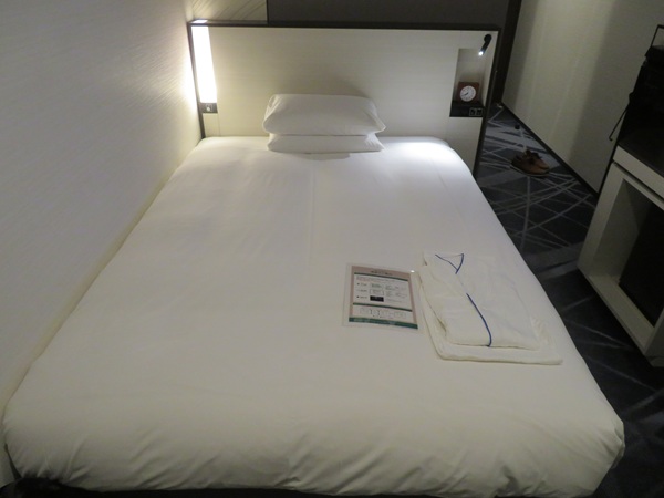 ベッドルームはほかのビジネスホテルと同じく、ベッドの横に机とテレビが置いてあります。