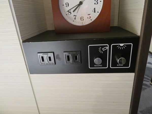 枕元には右側にコンセントが二つ、照明のスイッチが二つあります。左側の照明のスイッチは左側に単独であります。